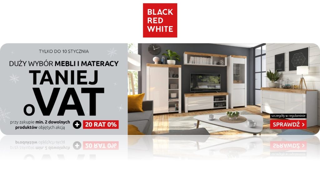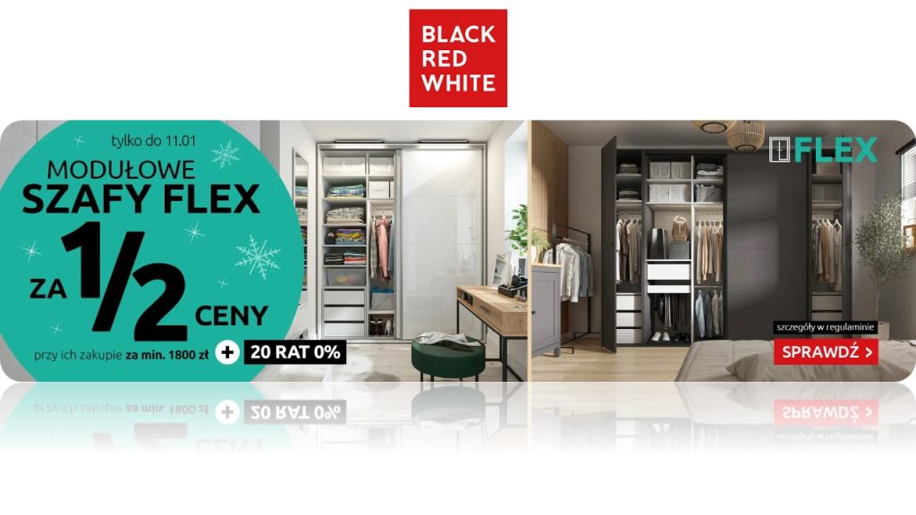 na setki mebli i dodatków BLACK RED WHITE taniej do 60% oraz 20 rat 0%. Promocja ważna do 11.01.2026 lub do wyczerpania zapasów. Dodatkowo meble kuchenne BRW do 45% Taniej oraz szafy FLEX za połowę ceny.
