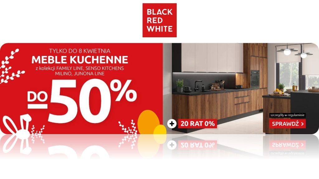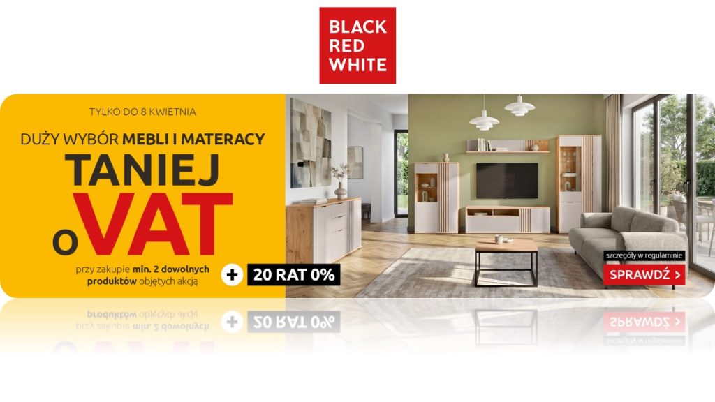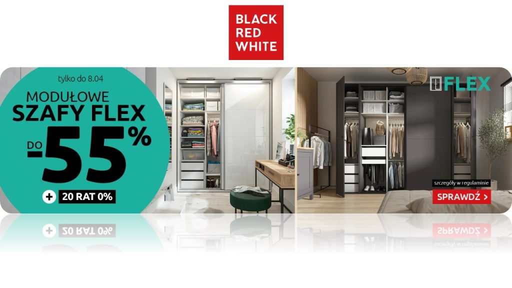 na setki mebli i dodatków BLACK RED WHITE taniej do 55% oraz 20 rat 0%. Promocja ważna do 11.01.2026 lub do wyczerpania zapasów. Dodatkowo meble kuchenne BRW do 50% Taniej oraz szafy FLEX do 55% taniej.