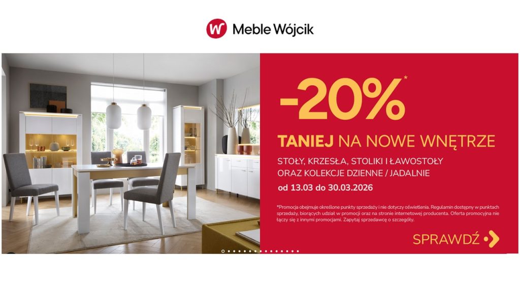 -20% taniej na nowe wnętrze z MEBLE WÓJCIK Planujesz odświeżenie salonu, jadalni lub całej strefy dziennej? Teraz jest ku temu doskonała okazja. Od 13 marca do 30 marca 2026 r. trwa promocja, w ramach której możesz skorzystać z 20% rabatu na wybrane produkty. Promocją objęte są stoły, krzesła, stoliki i ławostoły, a także kolekcje dzienne i jadalniane. To świetny moment, aby stworzyć funkcjonalne i stylowe wnętrze w atrakcyjniejszej cenie. Nie zwlekaj – czas na zmianę zaczyna się dziś. Promocja to doskonała okazja, by urządzić swój dom z klasą i oszczędnością! 🏠 Kolekcje biorące udział w promocji : —> https://www.meblewojcik.com.pl/promocje/Serdecznie zapraszamy Salon meblowy MILANT-BIS Grodzisk Mazowiecki ul. Okulickiego 13